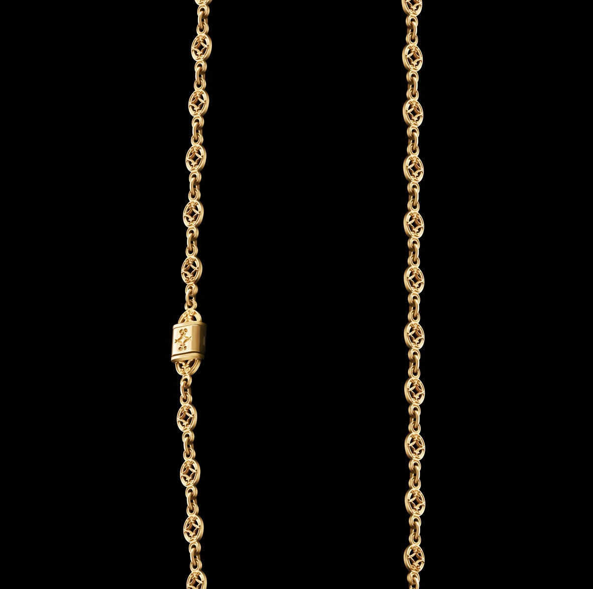 VALI 10mm motif chain necklace. Handcrafted in Los Angeles in 18k gold secured with a box clasp which is engraved with a motif. Model is wearing 24 Inch chain in 18k yellow gold.