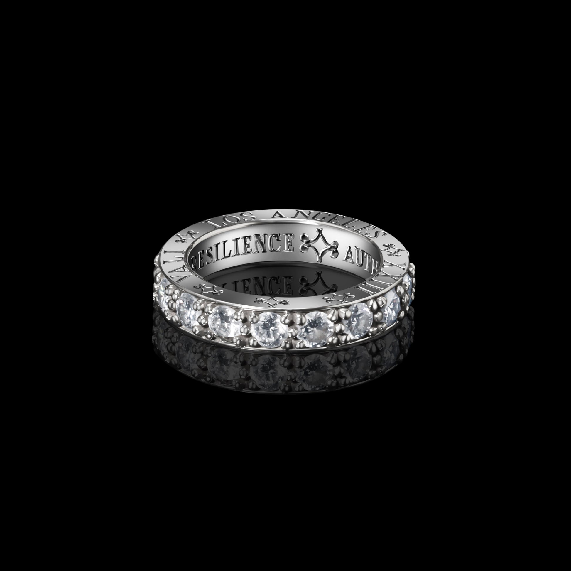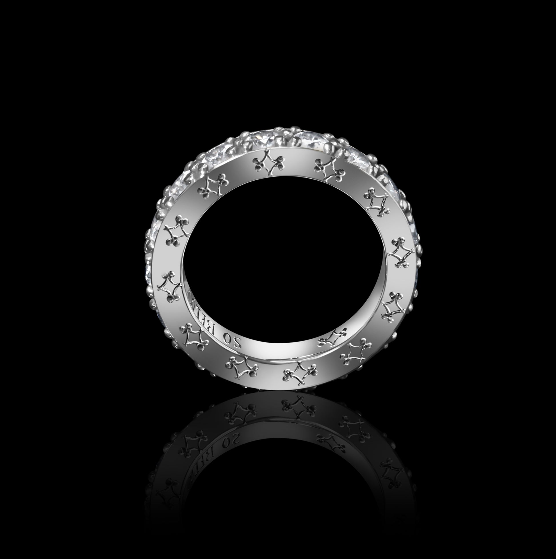 VALI's eternity band is set with seventeen 3.7mm precious diamonds or black diamonds. Handcrafted in Los Angeles with engraving on all surface areas of the ring (each side and the inside). Available in 18k yellow, white and rose gold.