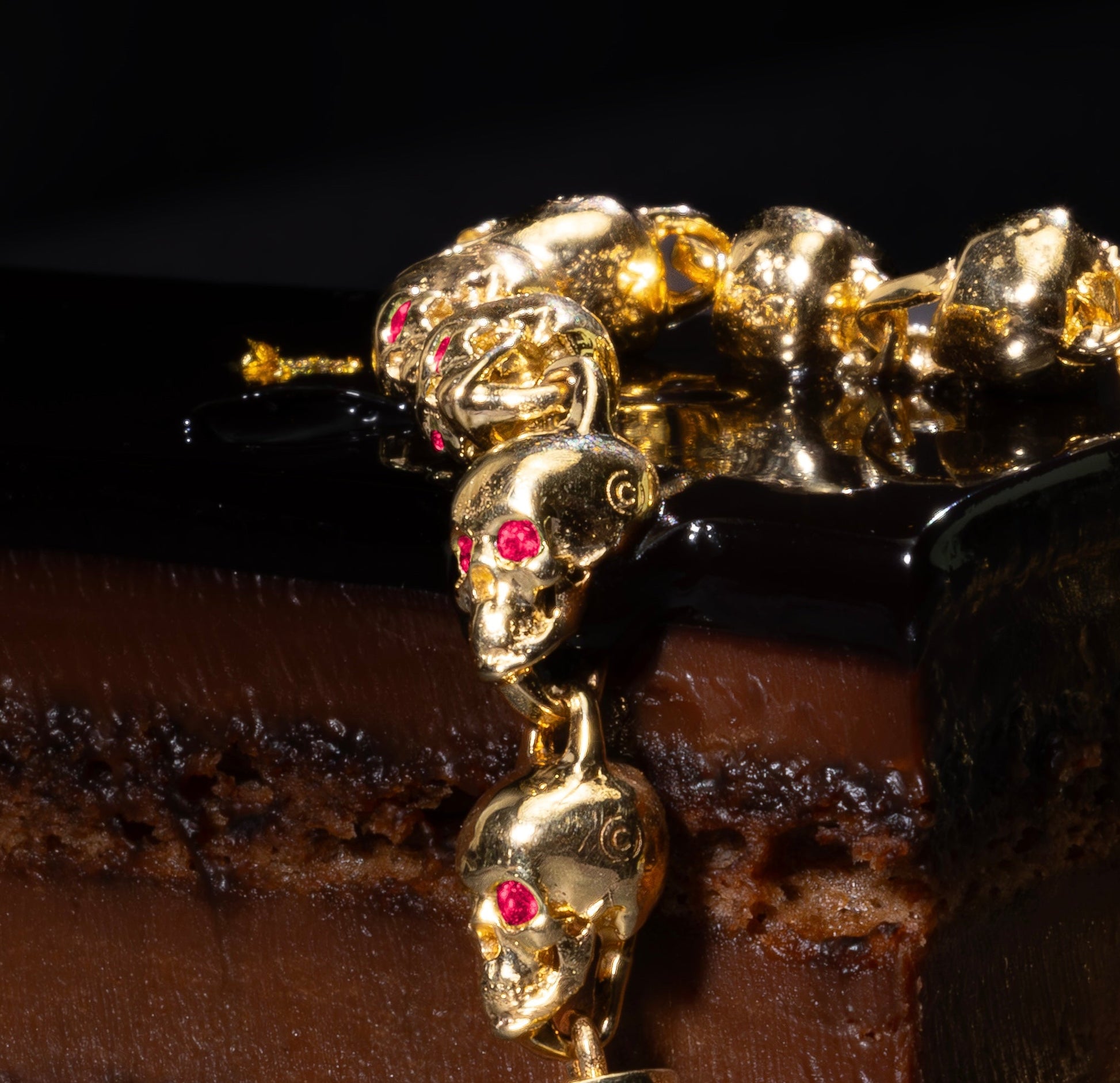 VALI's intricately designed custom mini skull bracelet with two precious stones set as the eyes in each of the links and an additional four stones adorning the clasp in natural settings. Handcrafted in Los Angeles in premium in 18k gold.