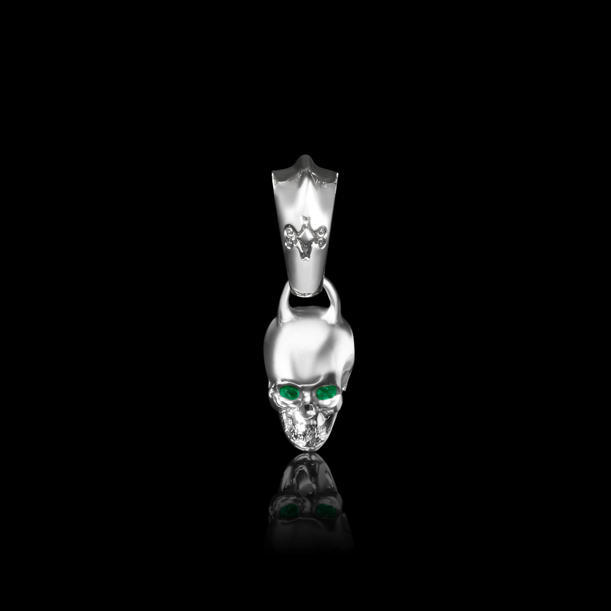 VALI's custom mini skull pendant with two emeralds set as the eyes. Handcrafted in Los Angeles in premium .925 sterling silver (skull size: 9mm length, 5mm width; includes ball chain).