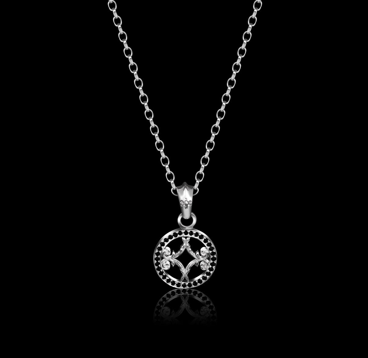 Beautifully carved motif enclosed in a 3mm circular border, set with 32 1.7mm black diamonds. Handcrafted in Los Angeles in 18k Gold (chain included).