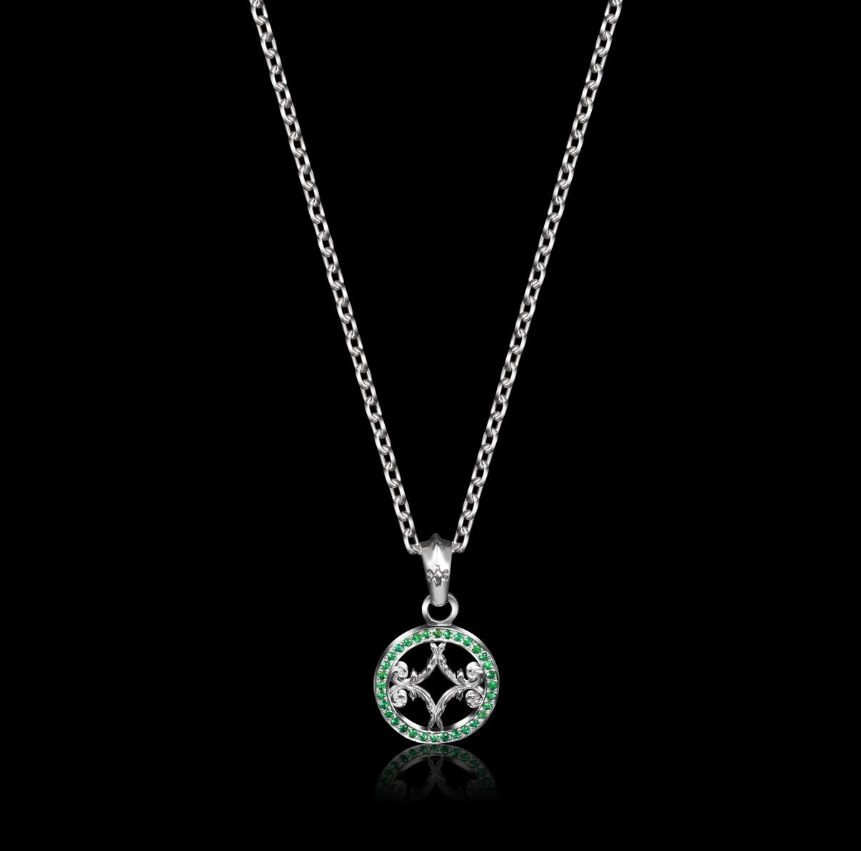 Beautifully carved motif enclosed in a 3mm circular border, set with 32 1.7mm diamond cut emeralds. Handcrafted in Los Angeles in premium .925 sterling silver (24 inch chain included).