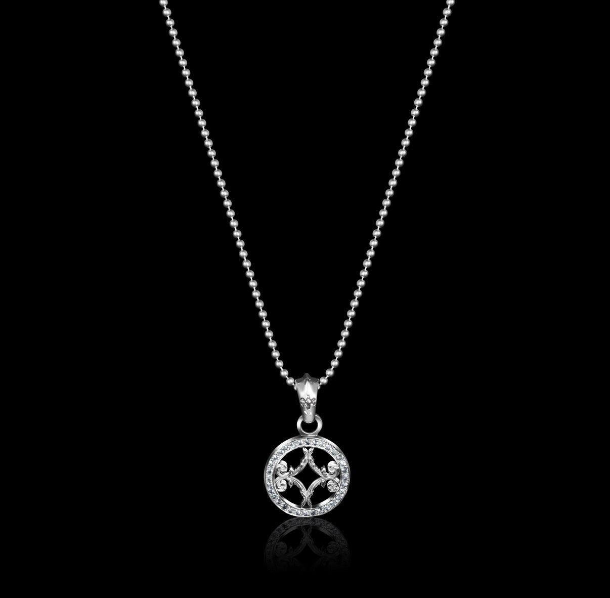 Beautifully carved motif enclosed in a 3mm circular border, set with 32 1.7mm natural diamonds. Handcrafted in Los Angeles in premium .925 sterling silver (24 inch chain included).