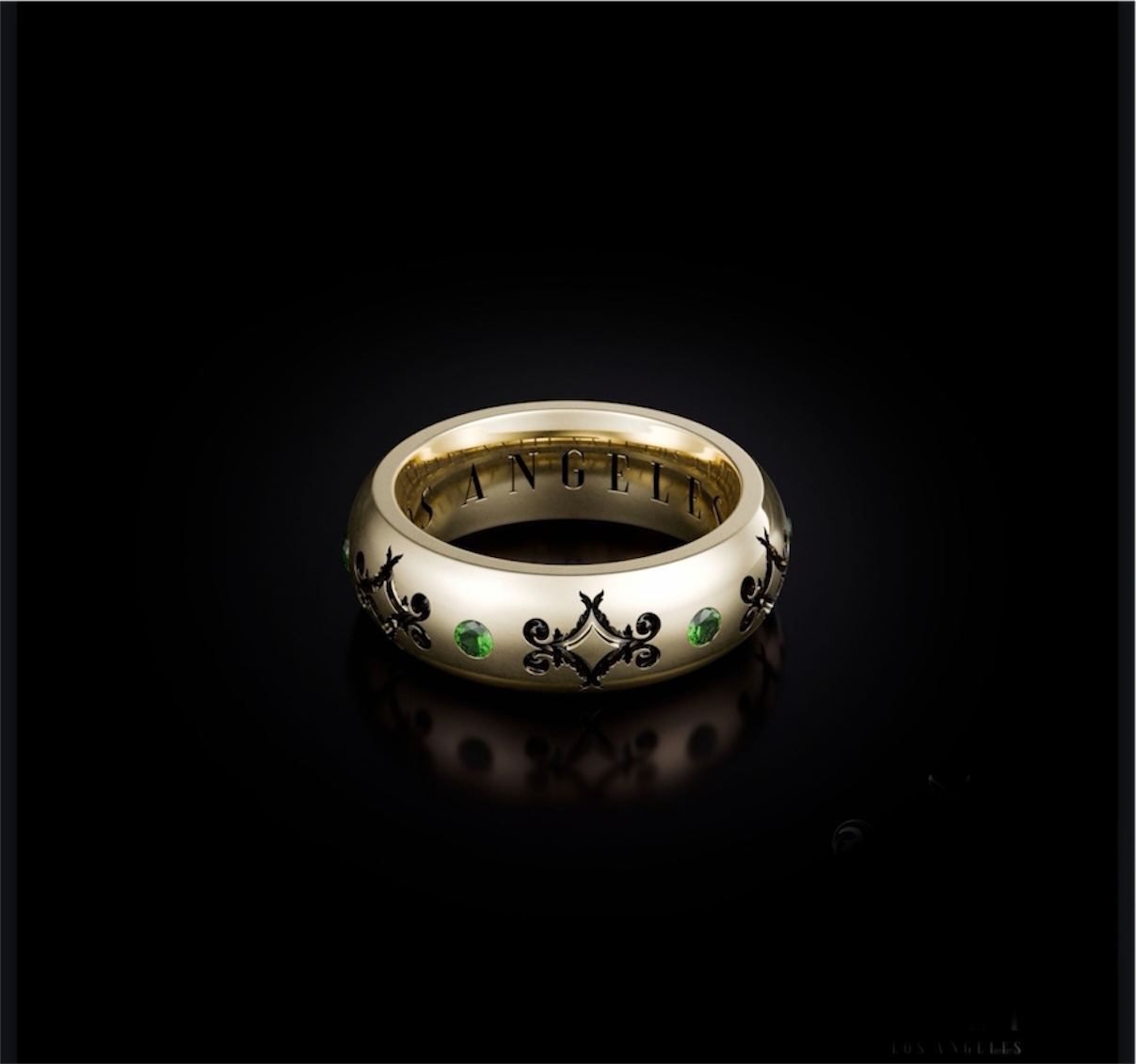 Half-round ring engraved with six motifs and six precious stones set between each motif. Handcrafted in Los Angeles in 18k gold, with additional engraving on the inside of the band.