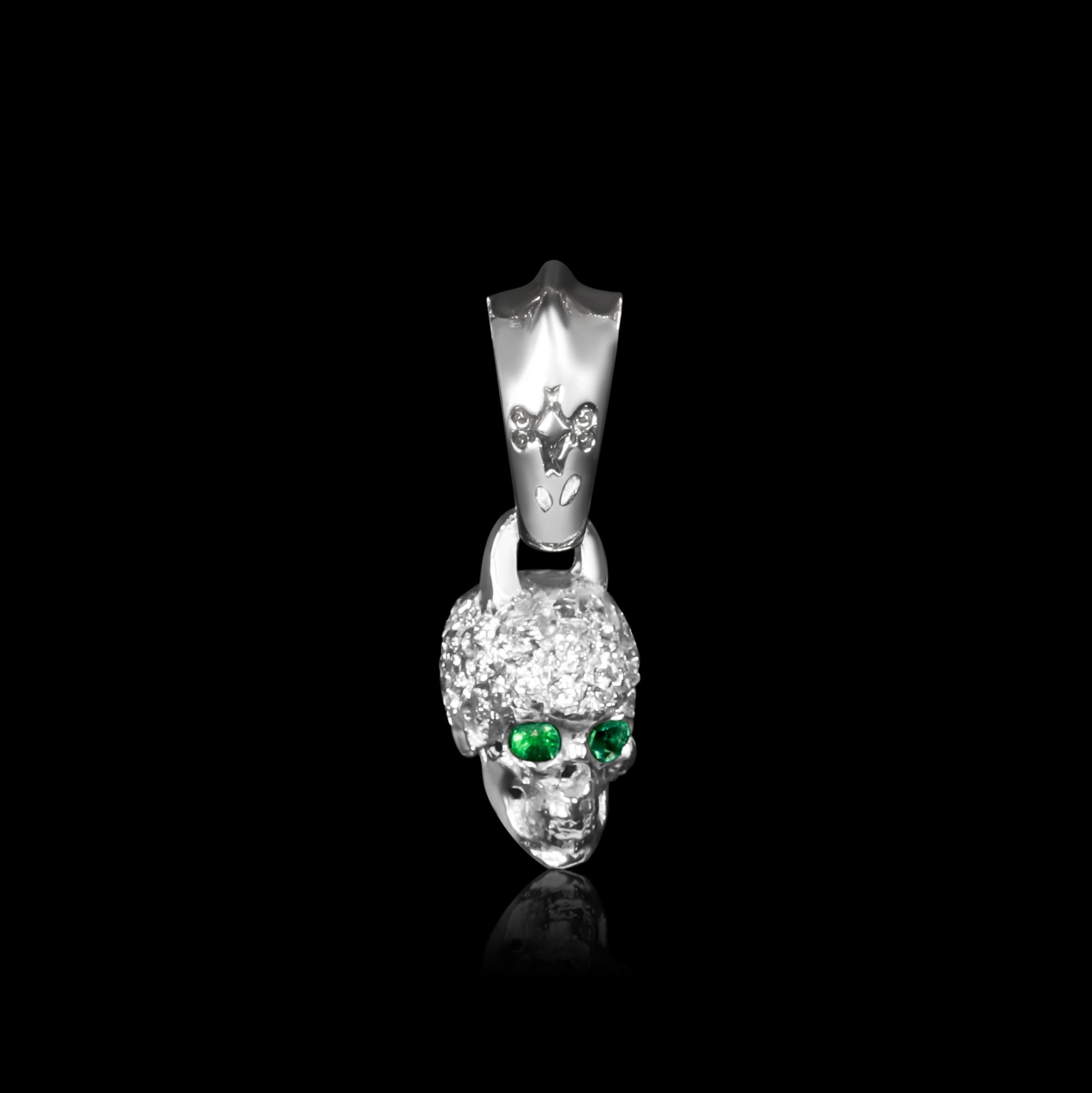 VALI's custom mini skull, pave diamonds with two precious stones set as the eyes. Handcrafted in Los Angeles in 18k gold (9mm length, 5mm width). Pendant only (chain not included).