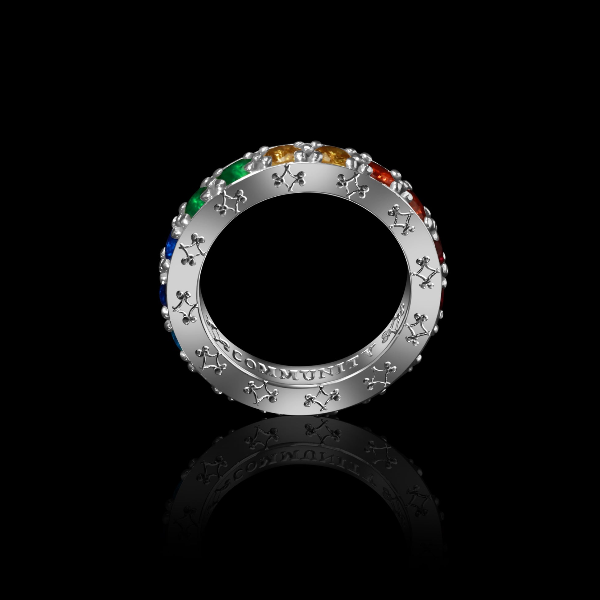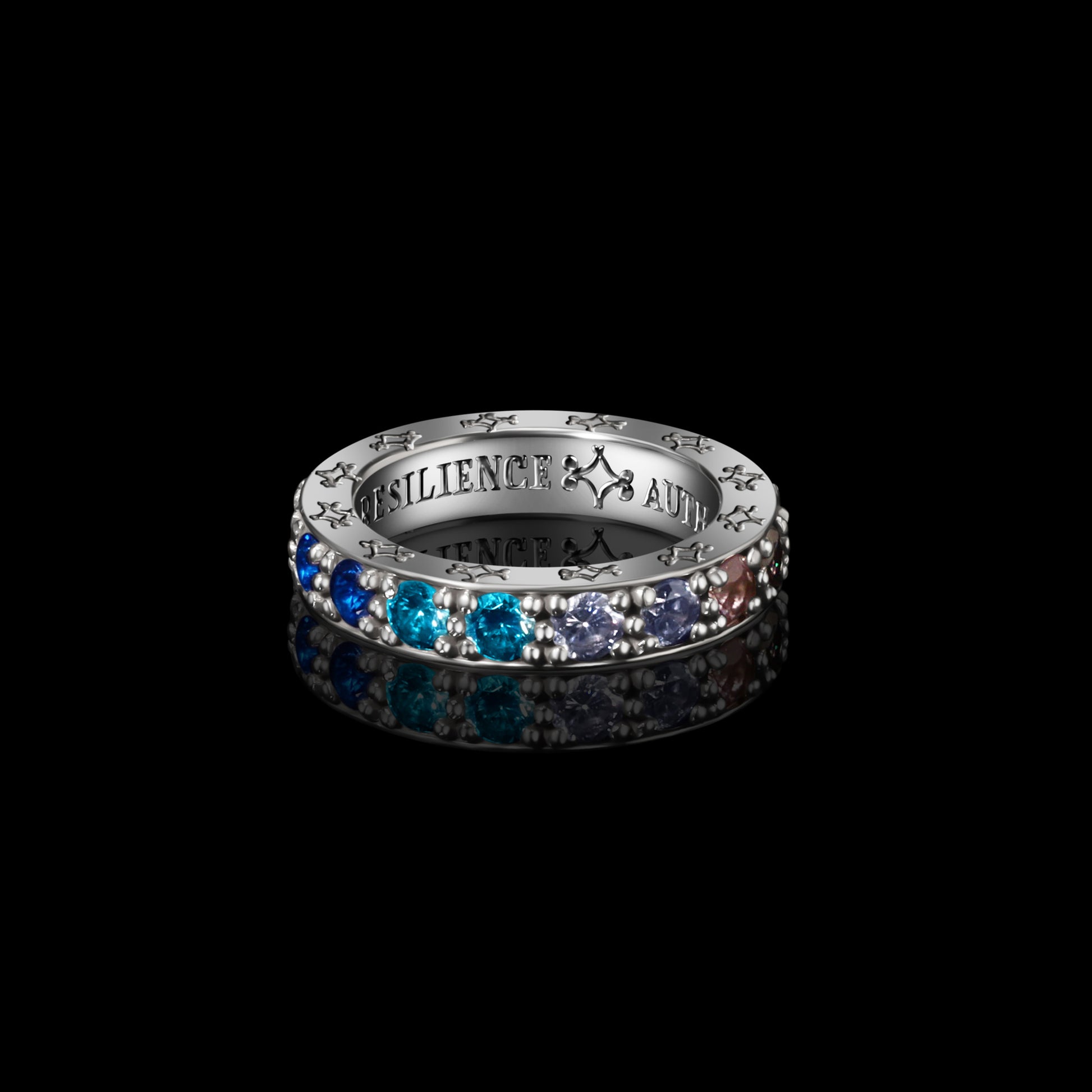 VALI's sapphire ombré eternity band is set with seventeen 3.7mm sapphires with color gradients transitioning and blending from warm to cool hues mimicking the spectrum of a rainbow. Handcrafted in Los Angeles with engraving on all surface areas of the ring (each side and the inside). Available in 18k yellow, white or rose gold.